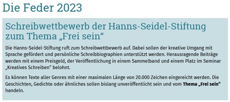 - Teilnahme am Schreibwettbewerb der Hans-Seidel-Stiftung zum Thema "Frei sein"